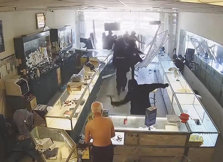 More than a dozen masked individuals dressed in dark clothing poured into the shop, smashing display cases and grabbing merchandise.