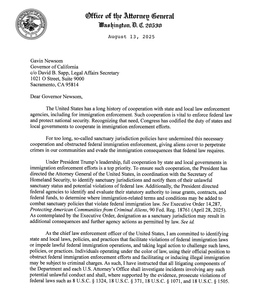 In the letter to Newsom, Bondi stressed that cooperation between federal, state, and local law enforcement is essential to enforcing immigration law and protecting national security.