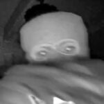 Close-up frames reveal the suspect’s eyes, eyebrows, and possible dark facial hair, such as a mustache. No vehicle is seen in the footage.