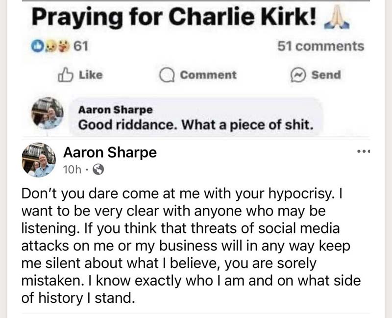 Aaron Sharpe, co-owner of Lucius Q, called Kirk a “piece of s—” in a Facebook post shortly after the 31-year-old was shot Wednesday at Utah Valley University.