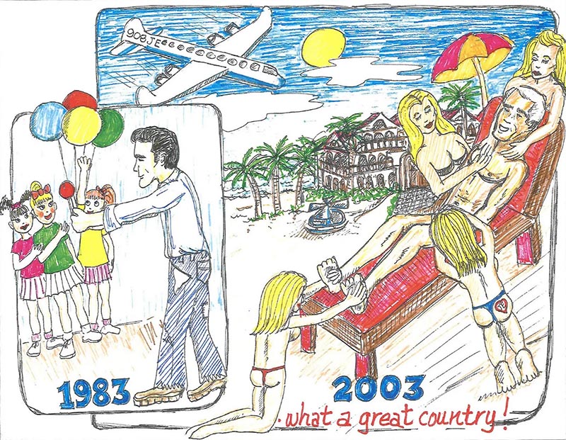 Beside it is a later sketch showing him reclining nude on a lounge chair in 2003 while four blonde women massage him.