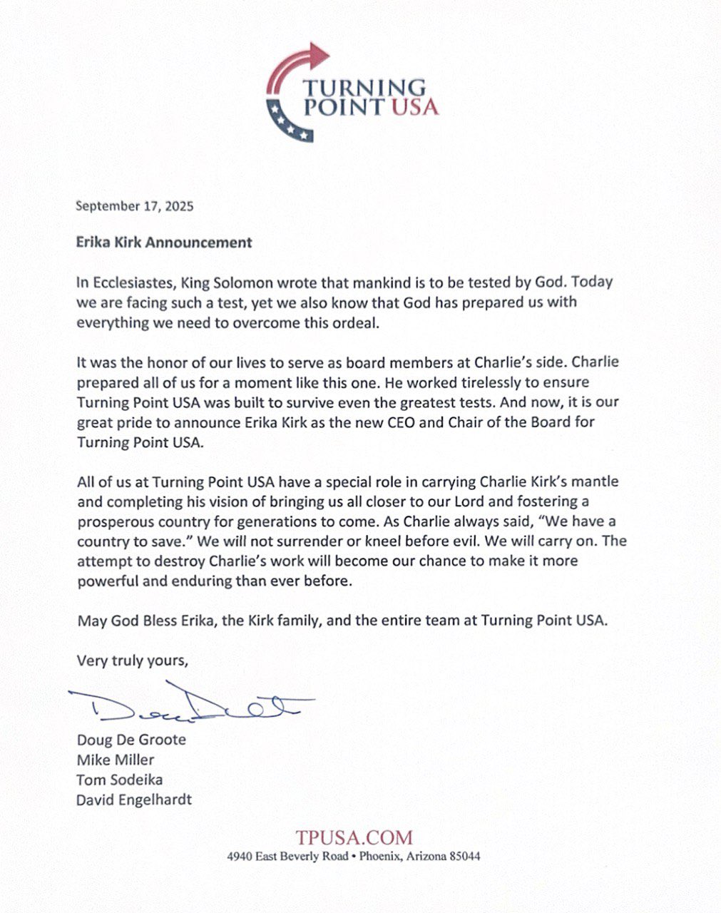 In a news release, TPUSA’s board praised Charlie Kirk’s preparation and vision.