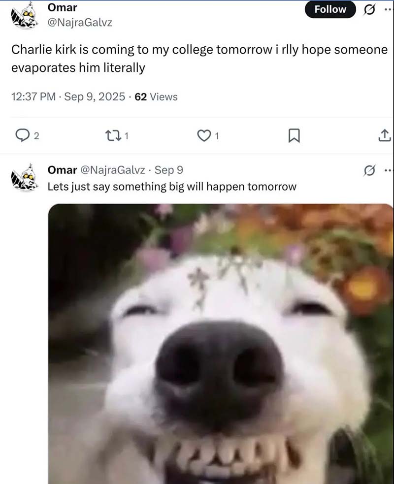 One post, made Sept. 9, read: “Charlie Kirk is coming to my college tomorrow i rlly hope someone evaporates him.”
