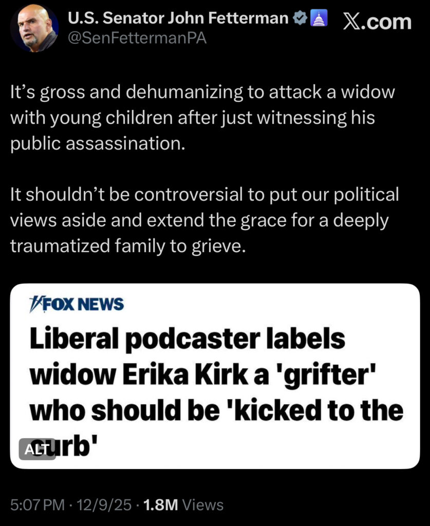 Fetterman has consistently spoken against political violence. Immediately after the September 10, 2025, shooting (before Kirk’s death was confirmed), he posted: “I condemn this in the strongest terms. There is ZERO place in our great country for these horrendous acts of political violence. We must find a better way forward. May Charlie Kirk have a full and quick recovery.” Later that day, he added: “Our family grieves for Charlie Kirk’s family. We must collectively find a way forward during these polarized times.”