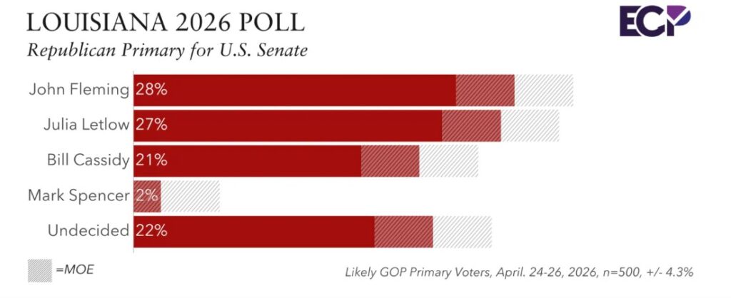 In this poll, 28% of likely GOP primary voters support Fleming, with Letlow close behind at 27%. Cassidy lags at 21%, while 22% are still undecided.