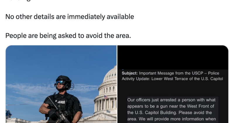 USCP wrote on X, “Our officers just arrested a person with what appears to be a gun near the West Front of the U.S. Capitol Building. Please avoid the area. We will provide more information when new information is confirmed.”