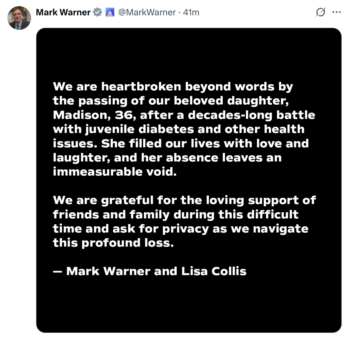 On Monday, Sen. Mark Warner and his wife, Lisa Collis, shared the heartbreaking news that their daughter, Madison Warner, has passed away at the age of 36 following a prolonged struggle with health difficulties.
