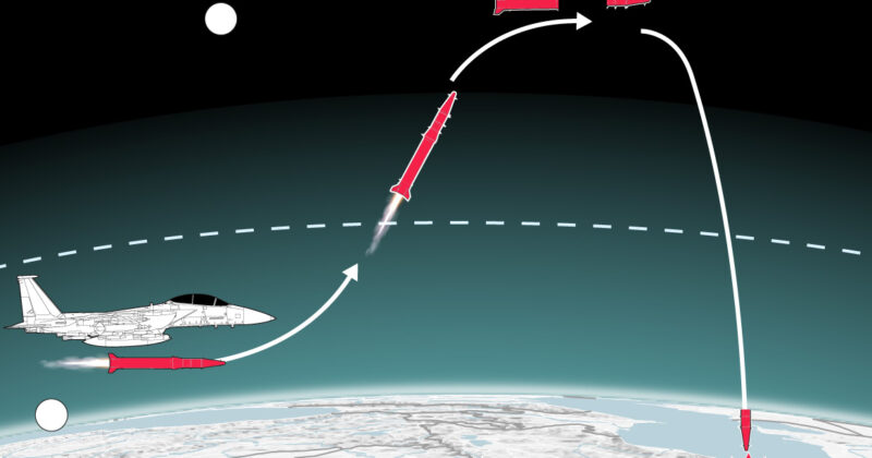 After launch the missile accelerates upward and exits the atmosphere before following a long arc through space and descending toward its target.