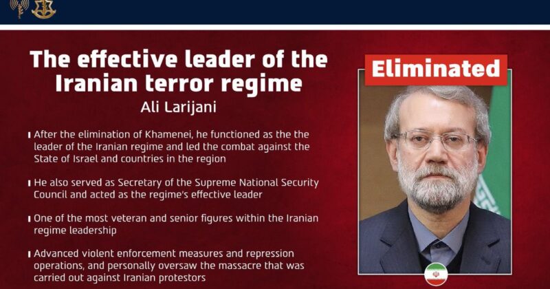 The Israel Defense Forces (IDF) confirmed that Ali Larijani, the Secretary of Iran’s Supreme National Security Council, and Basij commander Gholamreza Soleimani were killed. Israeli Defense Minister Israel Katz emphasized that their elimination was a direct blow to Iran’s oppressive machinery.