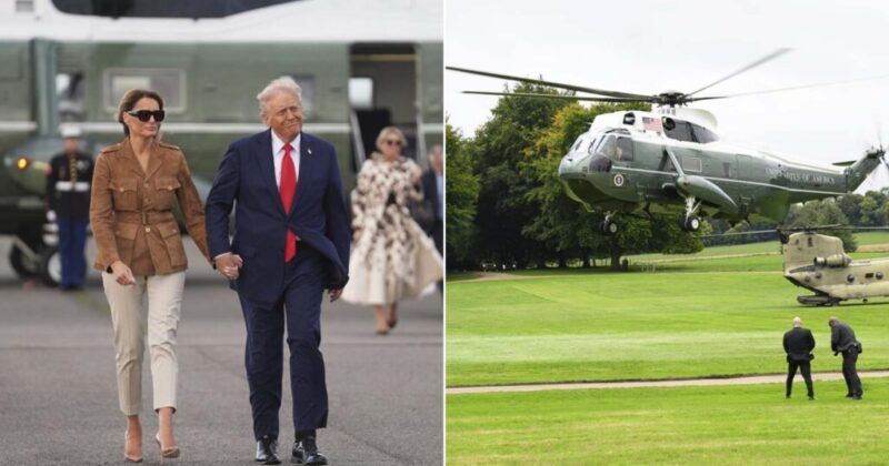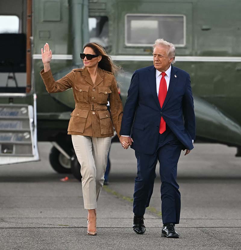 US President Donald Trump (R) and US First Lady Melania Trump (L) walk across the tarmac from the Marine One helicopter toward Air Force One at Stansted Airport, in Stansted, north of London, on September 18, 2025, to leave at the end of the US President’s second State Visit. Donald Trump warned that Russia President Vladimir Putin had “really let me down” as he met Prime Minister Keir Starmer for wide-ranging talks on September 18, the final day of the US president’s historic UK state visit. A day after King Charles III treated Trump to royal pageantry at Windsor Castle, the Republican flew to Starmer’s Chequers country residence for talks on thorny issues including the wars in Ukraine and Gaza. (Photo by ANDREW CABALLERO-REYNOLDS / AFP) (Photo by ANDREW CABALLERO-REYNOLDS/AFP via Getty Images)