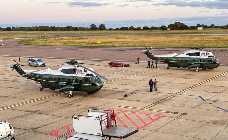 The presidential helicopter is also escorted by Osprey MV-22s.