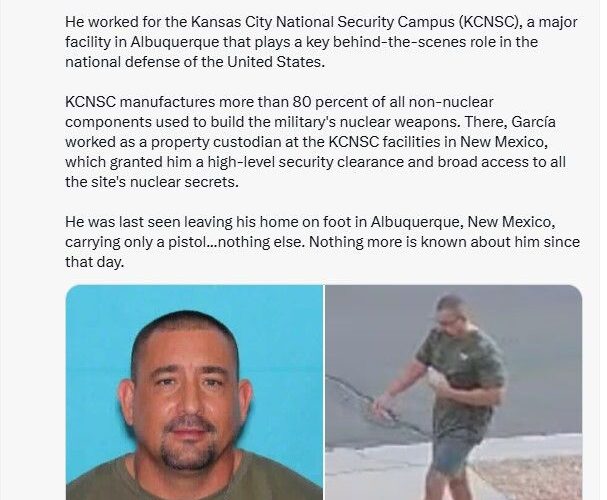 Following Garcia’s disappearance, KCNSC initiated a search for clues, examining work-related computers and files but found nothing. Concerns are growing as Garcia’s case marks the tenth incident in recent years where individuals linked to U.S. nuclear or space work have vanished or died under mysterious circumstances.