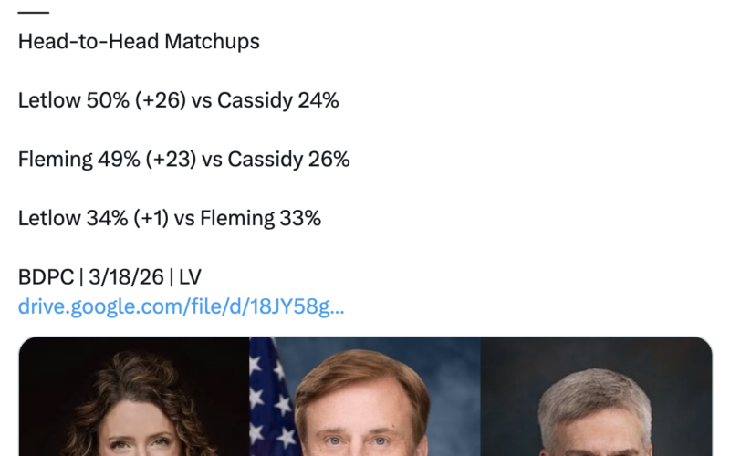 In a direct competition against Letlow, she significantly outpaces Cassidy with a whopping 50.2 percent to his 24.2 percent. Fleming also leads Cassidy with 48.7 percent over his 26.3 percent.
