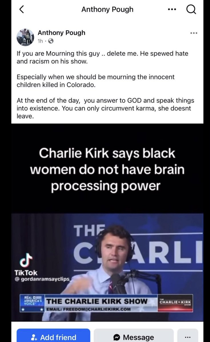 Some agents expressed outrage, saying Pough’s comments amounted to celebrating the murder of a political figure who had been closely aligned with President Donald Trump.