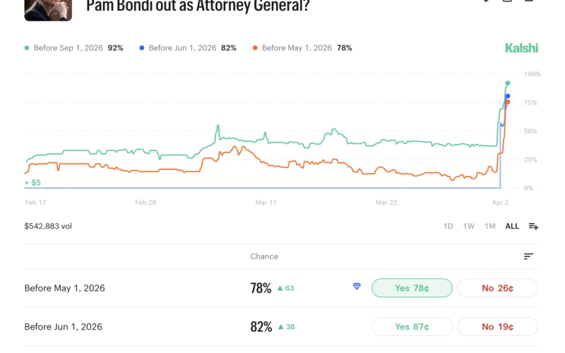 The Kalshi market now places a 78% likelihood on Bondi’s exit before May 1, which rises to 82% by June and peaks at 92% before September. This sharp increase follows a period when such expectations were much lower.