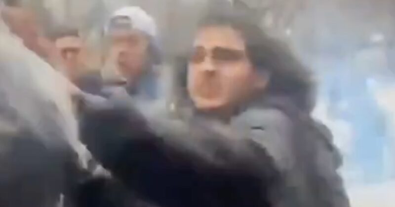 About 30 minutes into the event a man from the counter-protest allegedly produced an explosive device and threw it toward Lang’s group, where it landed in a crosswalk near police officers and emitted flames and smoke before striking a barrier and going out.