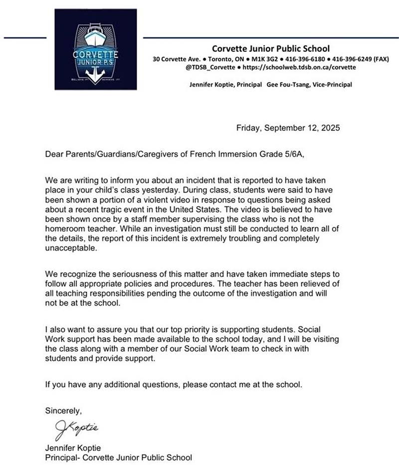 A public school teacher in Canada has been suspended for showing students the video of Charlie Kirk’s assassination.