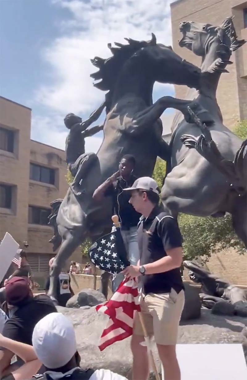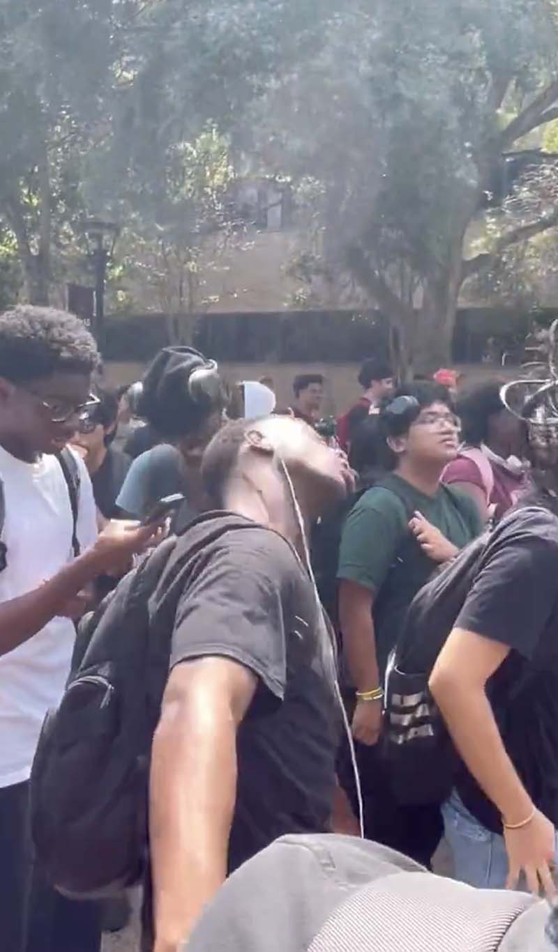This was at Texas State @txst a Charlie Kirk memorial event hosted by local TPUSA chapter. Student imitates Charlie Kirk’s death and mocks him, goes up to statue where TPUSA members are and imitates his death again, and spits near them. Also uses a vape/weed pen near end of video… pic.twitter.com/mVOHeh1jpk