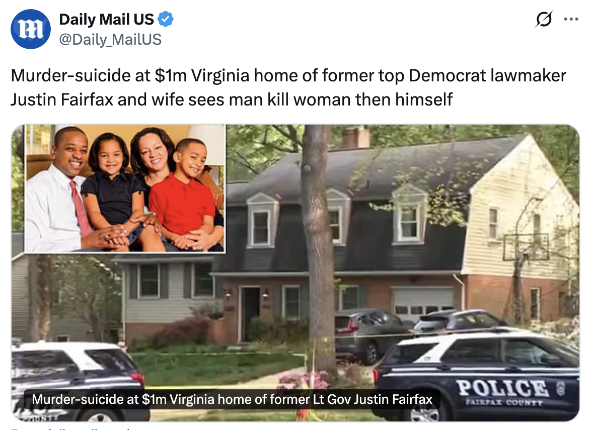 Former Virginia Lieutenant Governor Justin Fairfax has died in a tragic murder-suicide that took place in his Fairfax County residence early Thursday morning.