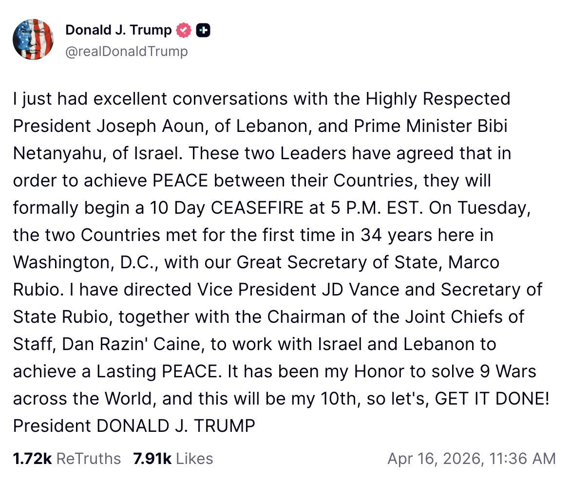 Trump Facilitates Temporary Truce Between Israel and Lebanon