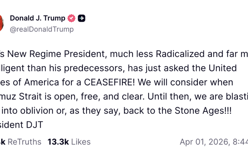 He stated, “Iran’s New Regime President, much less Radicalized and far more intelligent than his predecessors, has just asked the United States of America for a CEASEFIRE! We will consider when Hormuz Strait is open, free, and clear. Until then, we are blasting Iran into oblivion or, as they say, back to the Stone Ages!!! President DJT”